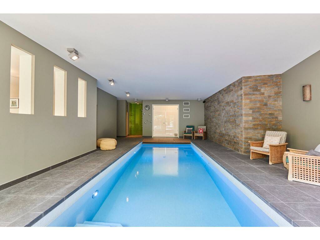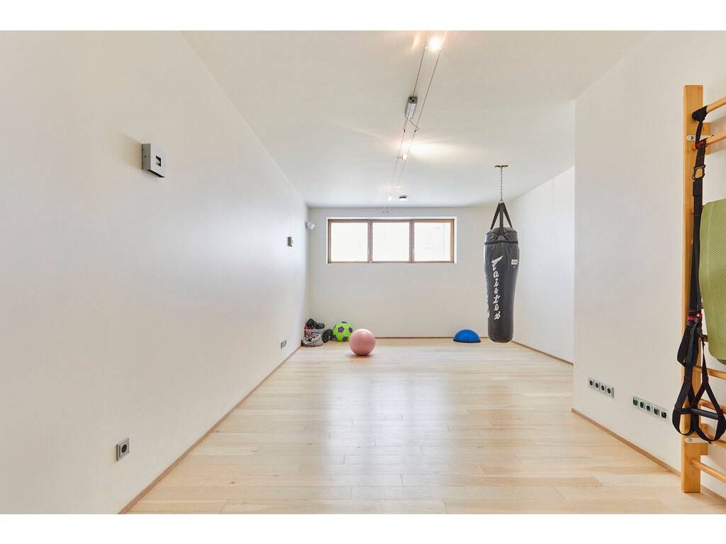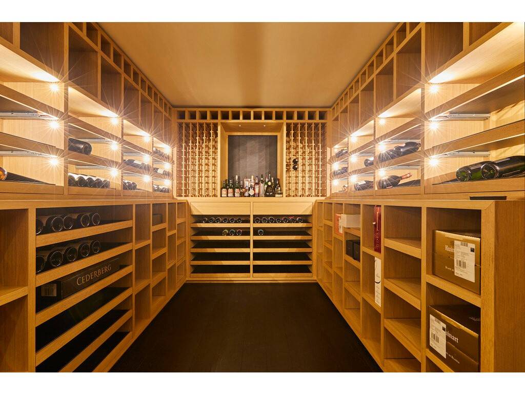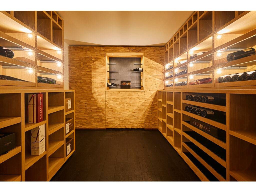 The basement includes an independent studio with separate entrance—ideal for guests or staff. The wellness area is equipped with an indoor swimming pool, sauna, shower, and fitness room. A climate-controlled wine cellar, multiple storage rooms, and technical spaces complete this level. A garage with space for three cars is also available.