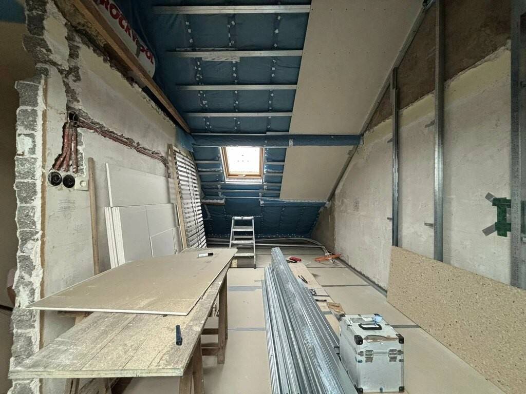 - Au 1er étage : une grande chambre (+/- 13,50m²) et une chambre d’enfant ou bureau (+/-10,60m²) avec accès direct aux combles