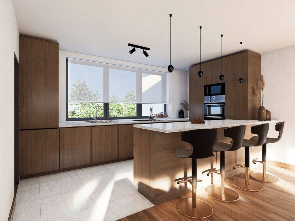 - triple glazed windows, electric shutters - floor heating in the apartments, - a controlled mechanical ventilation with a thermostat to regulate the temperature individually in each room.