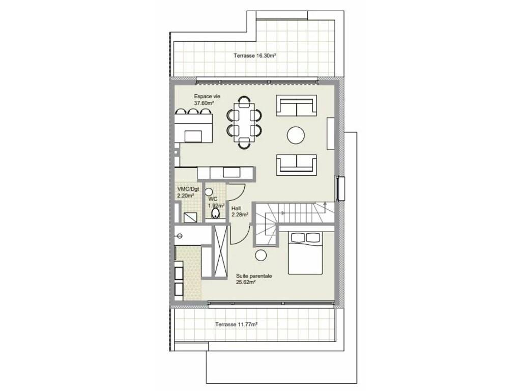 A living room/kitchen of 37.60 m² with access to the terrace.