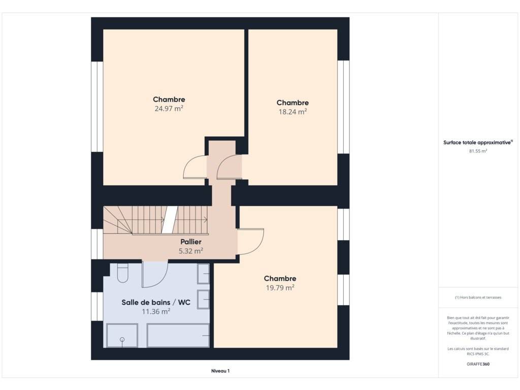 Au premier étage, la maison dispose de trois chambres d'environ 25, 19 et 18 m², ainsi que dune salle de bain.