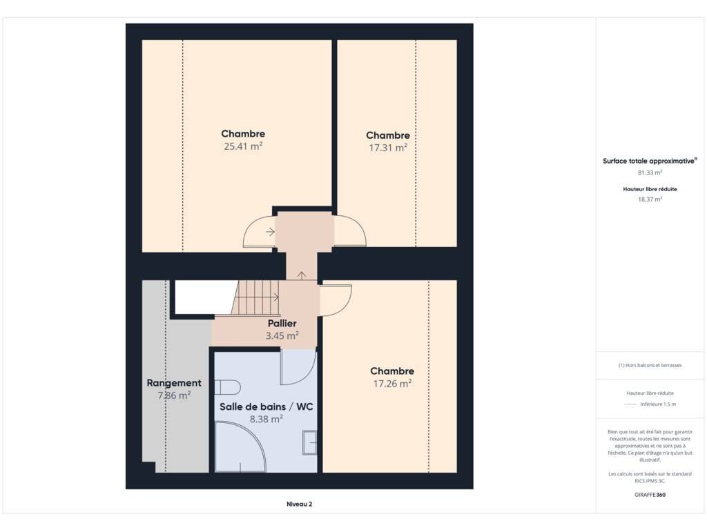 Le deuxième étage mansardé offre une première chambre de 25 m² au sol, ainsi que deux pièces d'environ 17 m² au sol qui pourraient être utilisées en tant que chambres, bureaux, salle de jeux, dressing ou espace de rangement.