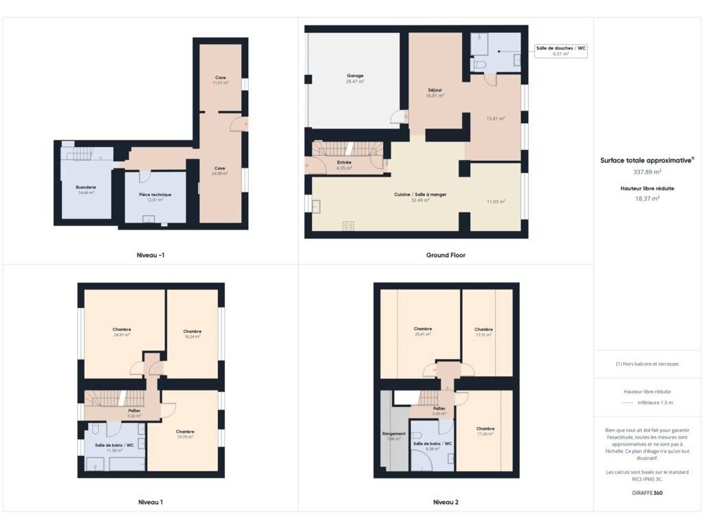 Elle offre une superficie totale de 337 m² dont environ 230 m² habitables.