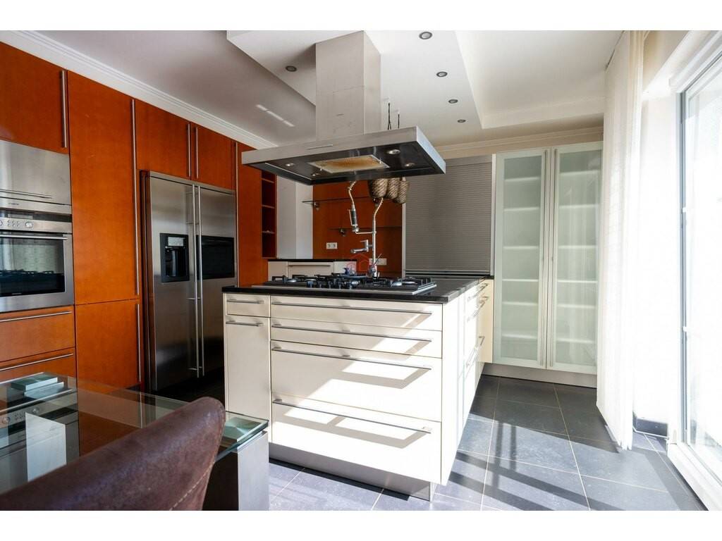 The living and dining area is bright and airy, with a direct view of the terrace. The separate kitchen features a transparent glass wall, making it a modern and fully equipped space with a breakfast nook and direct access to the terrace.