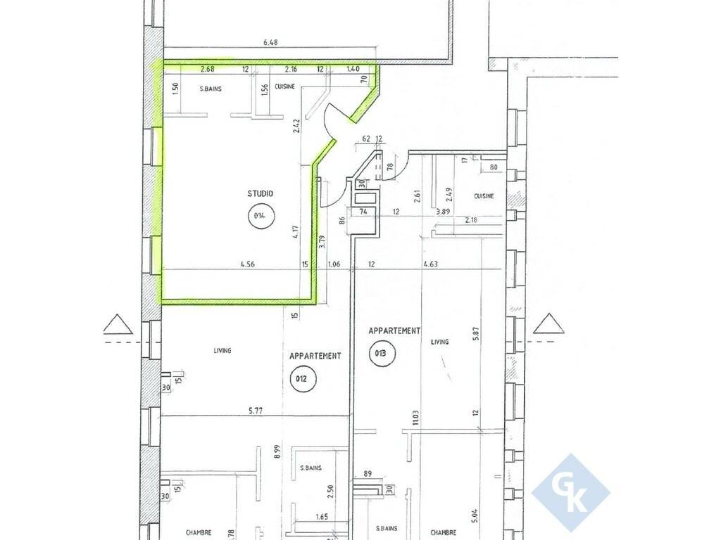 Composition du studio: 1er étage: hall d'entrée (4.03 m²); cuisine (3.37 m²); living/chambre (26.12 m²); salle de douche (4.02 m²); cave au rdch.