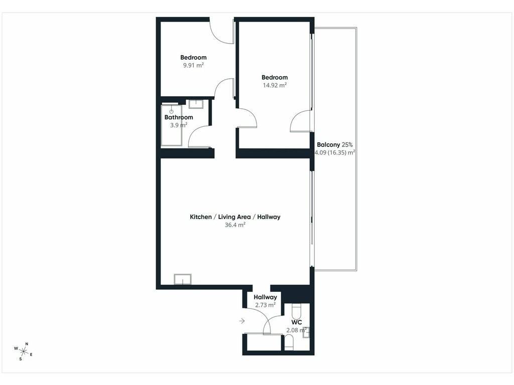 Layout: entrance hall - living room / fully equipped kitchen / dining area with direct access to the balcony - 2 bedrooms (one with direct access to the balcony) - shower room - separate WC