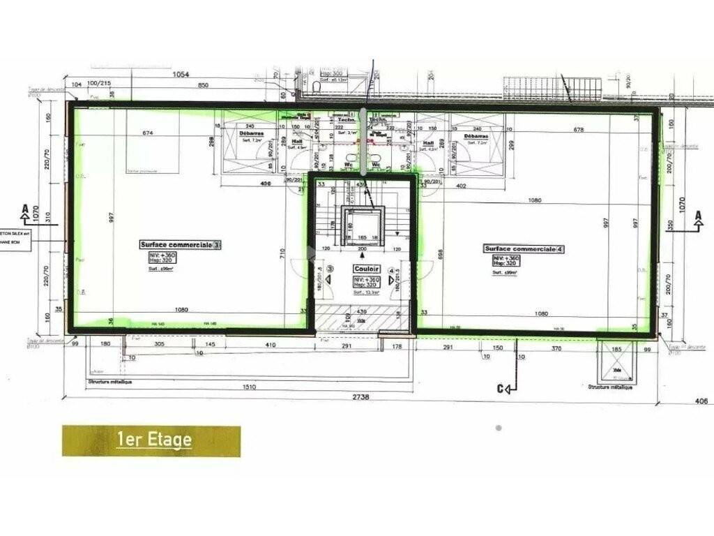 Les deux locaux situés à l'étage peuvent être loués séparément ou réunis en un seul grand local de 198 m² en supprimant une cloison.
