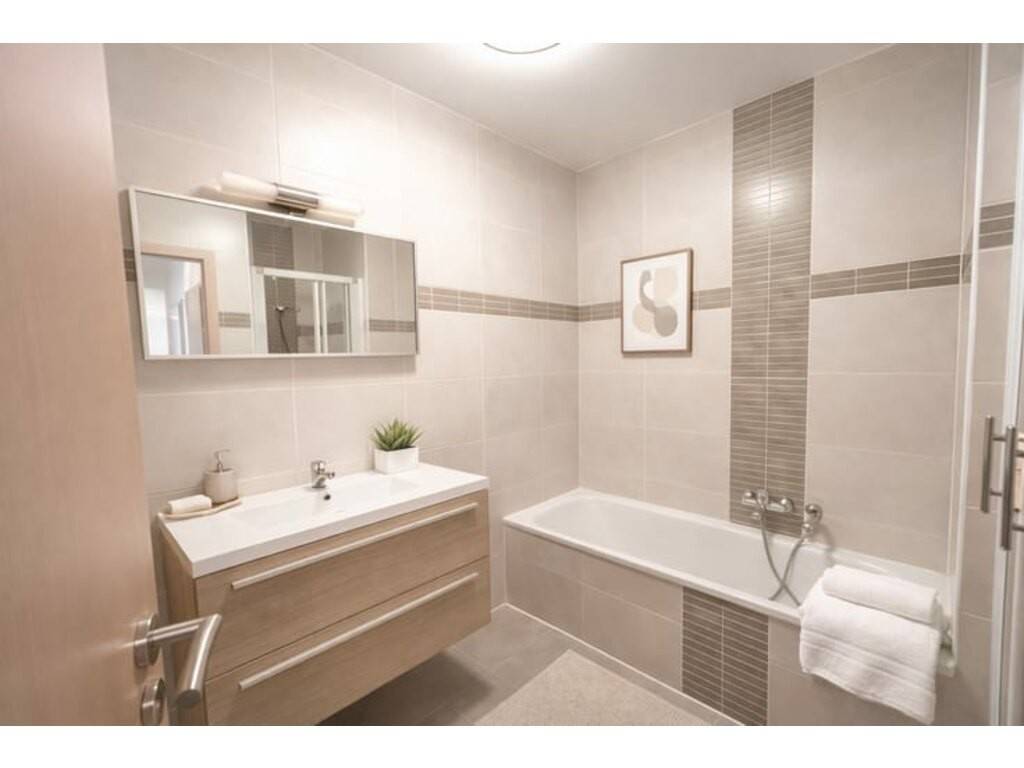 ➡️ Disposition : Un vaste séjour baigné de lumière avec accès à un balcon cosy, une cuisine entièrement équipée (four, hotte, plaque vitrocéramique, frigo, lave-vaisselle), une salle de bain complète (douche + baignoire + meuble lavabo), un WC séparé, une chambre spacieuse ainsi qu’une pièce polyvalente idéale comme dressing ou bureau.