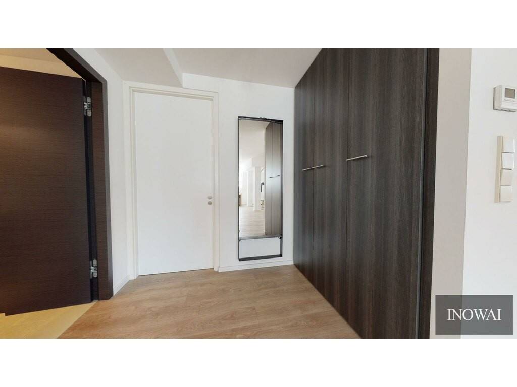 Located on the fourth floor, it opens onto an entrance hall with a built-in wardrobe, leading to a spacious living area with an open-plan, fully equipped kitchen, featuring both a lounge area and a workspace.