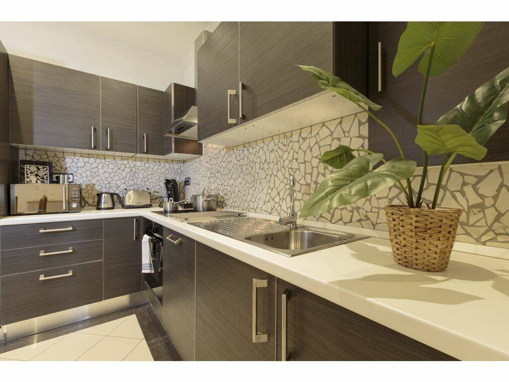 A separate open kitchen, fully equipped (dishwasher, refrigerator, microwave, oven, stovetop)