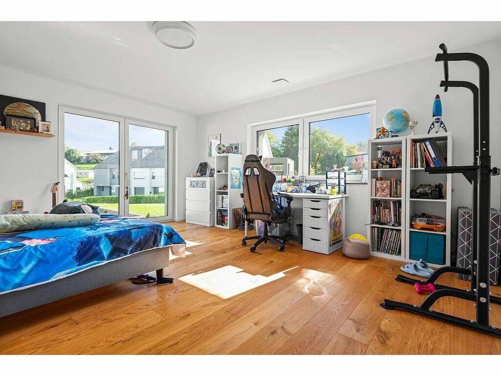 CMD Immobilière vous propose cette Superbe maison contemporaine 3 façades construit en 2021 Découvrez cette magnifique maison moderne et lumineuse, libre de trois côtés, située sur un terrain de 4a70ca au sein de la Cité an der Uecht à Kaundorf, dans un environnement résidentiel calme et agréable.