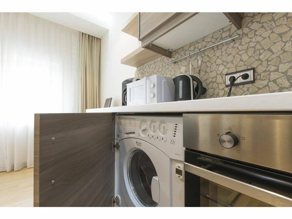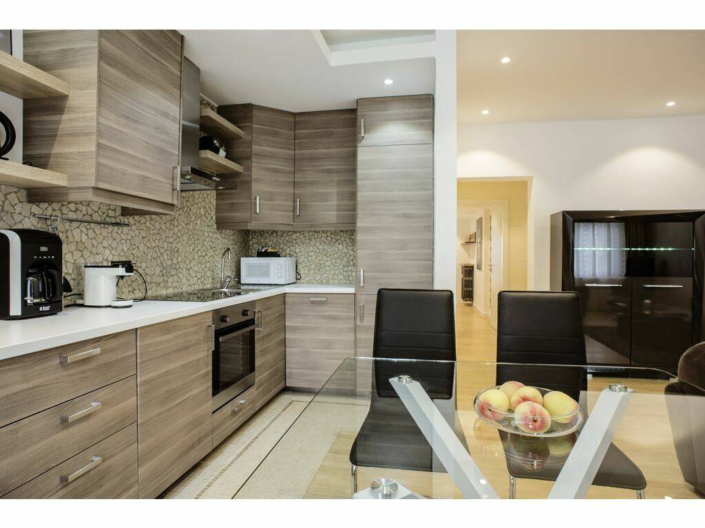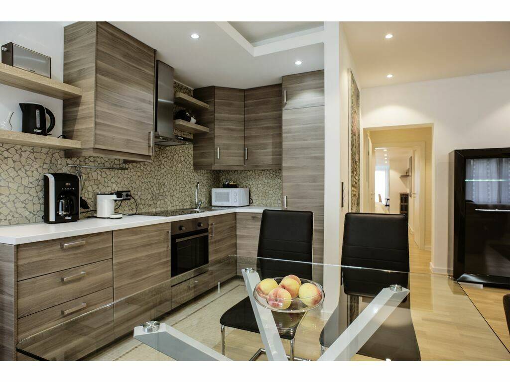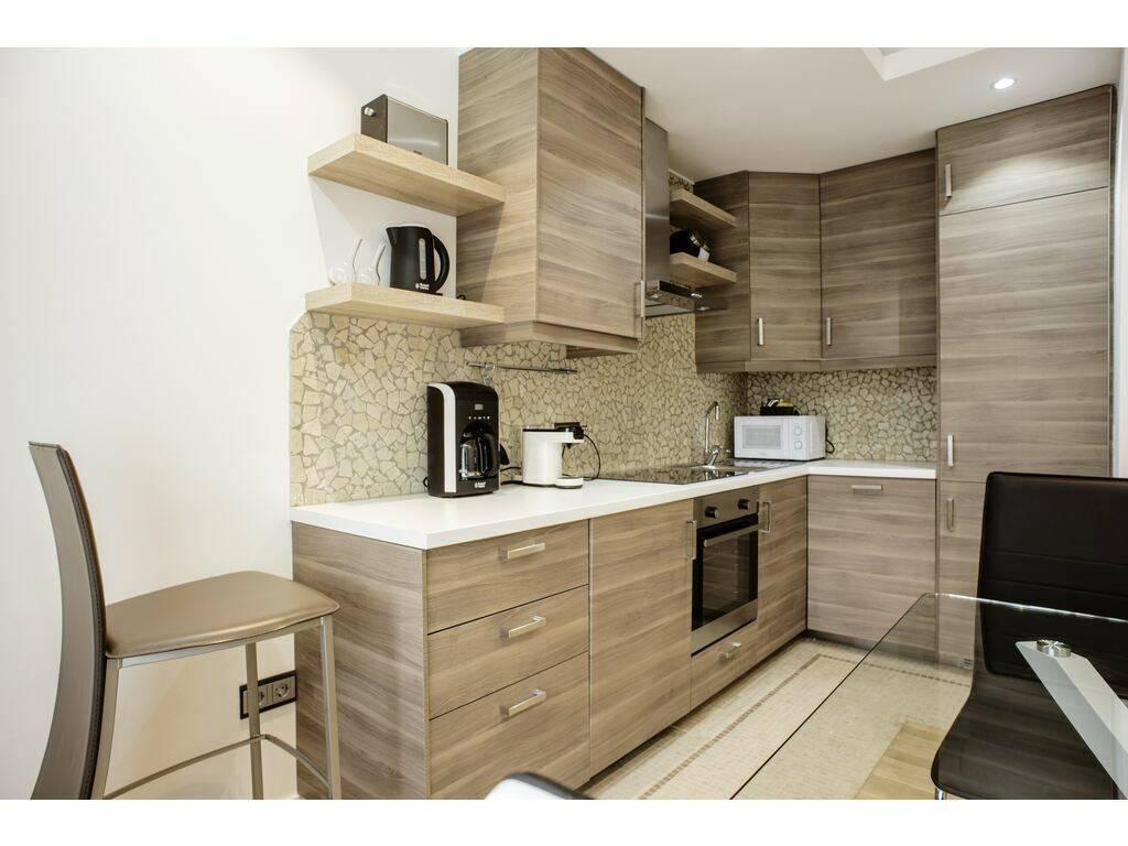 A separate open kitchen, fully equipped (dishwasher, refrigerator, microwave, oven, cooking plates)