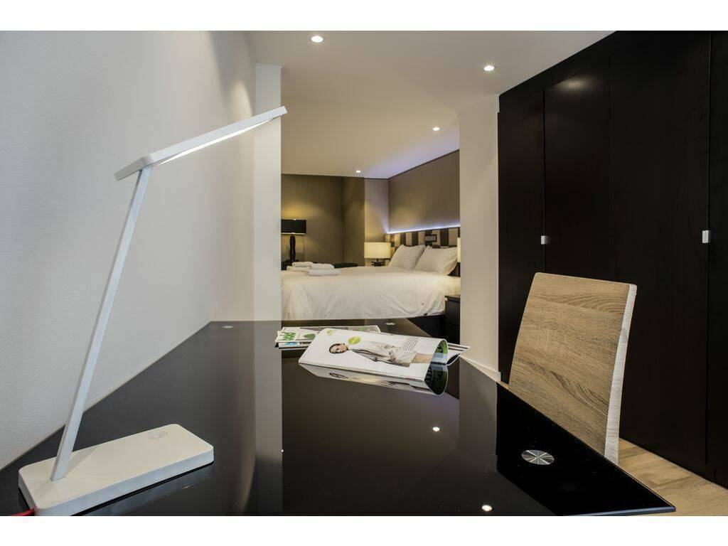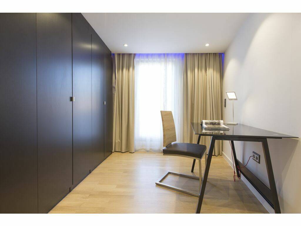 A spacious and bright bedroom with integrated office area