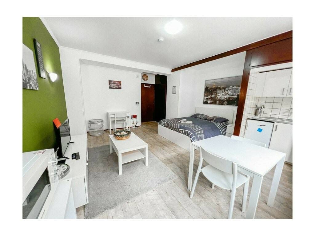 The studio is fully equipped with a kitchenette featuring an electric cooker, a small fridge, a dishwasher, cooking utensils, microwave, coffee maker, kettle and toaster.