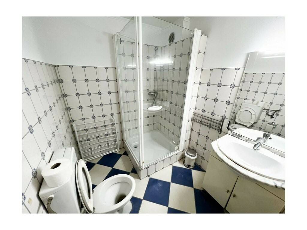 The bathroom contains a shower with a toilet and sink, a hair dryer, washing machine and drying rack.