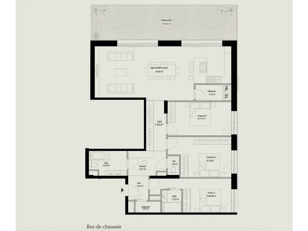 - Spacieux hall d'entrée avec espace bureau et vestiaire - WC séparé - Spacieux living/cuisine de 48 m2 avec accès terrasse - Terrasse de 37 m2 - Jardin privatif de 248 m2 - 3 grandes chambres dont une avec salle de douche privative - Salle de bains avec WC - Débarras - Buanderie