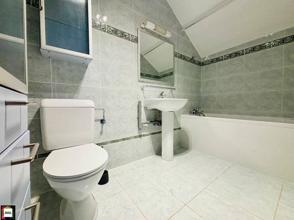 À létage, un palier dessert les deux chambres légèrement mansardée ainsi quune salle de bains équipée dune baignoire et dun meuble vasque.