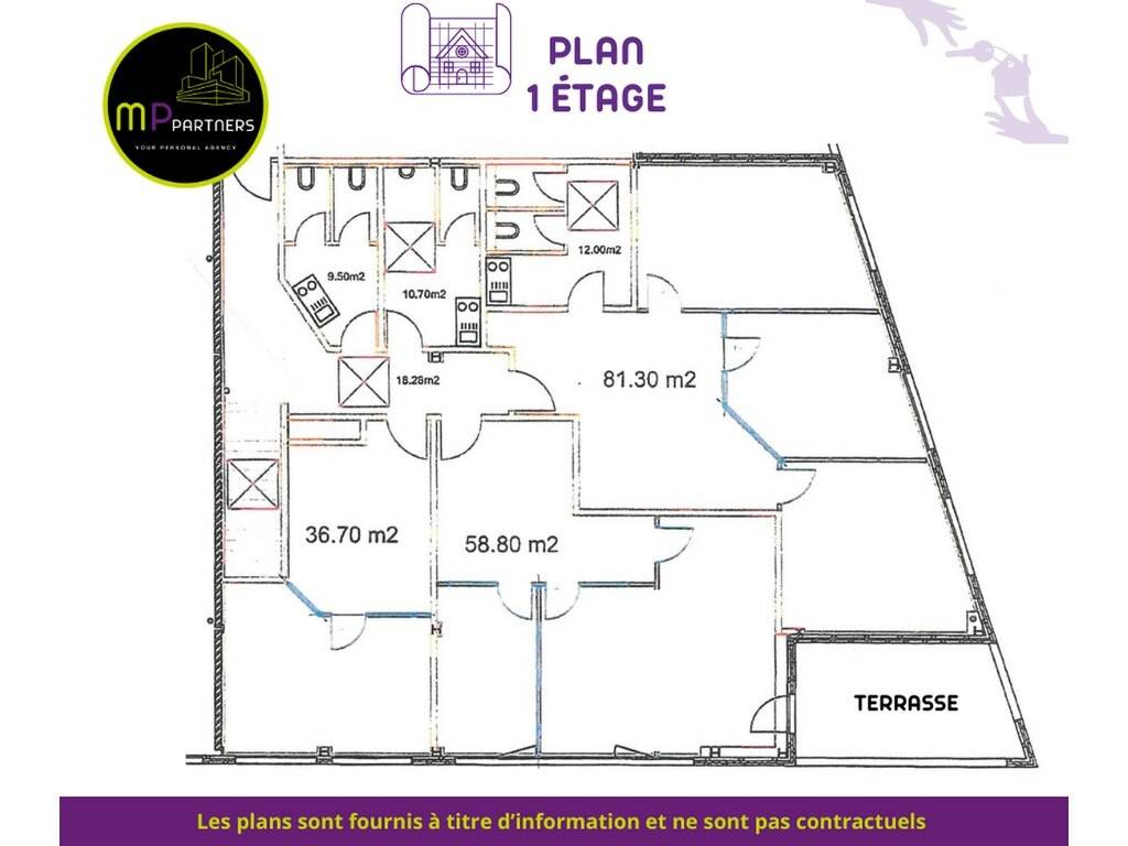 The building is laid out as follows: - 1 office with a kitchen area and restrooms, 47.00 m² - 1 office with kitchen and restroom facilities, 93.00 m² - 1 office with kitchen and restroom facilities, 69.00 m², with access to a beautiful terrace of approximately 15.00 m²