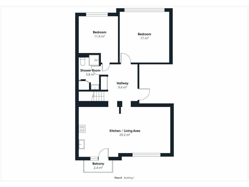 First floor: entrance hall (9.6 m²) - kitchen opening onto the living/dining room (29.2 m²) with access to the balcony - 2 bedrooms (17 m² + 11.4 m²) - shower room and WC (3.8 m²)
