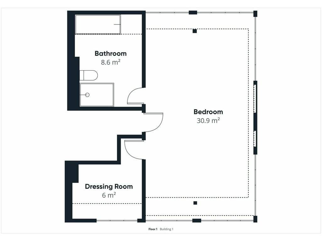2nd floor: master bedroom (31 m²) - bathroom with WC (8.6 m²) - dressing room (6 m²)