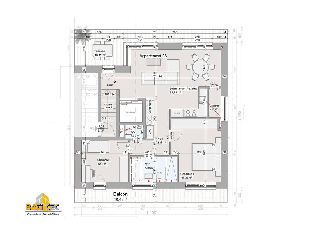 Le penthouse se compose d'un hall d'entrée, d'un spacieux séjour avec cuisine ouverte de 29,71 m² donnant accès à deux magnifiques terrasses privatives de 10,40 m² et 16,19 m², de deux chambres à coucher de 10,20 m² et 15,06 m², d'une salle de bain avec fenêtre équipée d'une baignoire, d'un lavabo et d'un WC, ainsi que d'un WC séparé. Une cave privative C4 de 7,66 m² et deux emplacements de parking intérieurs complètent ce bien.
