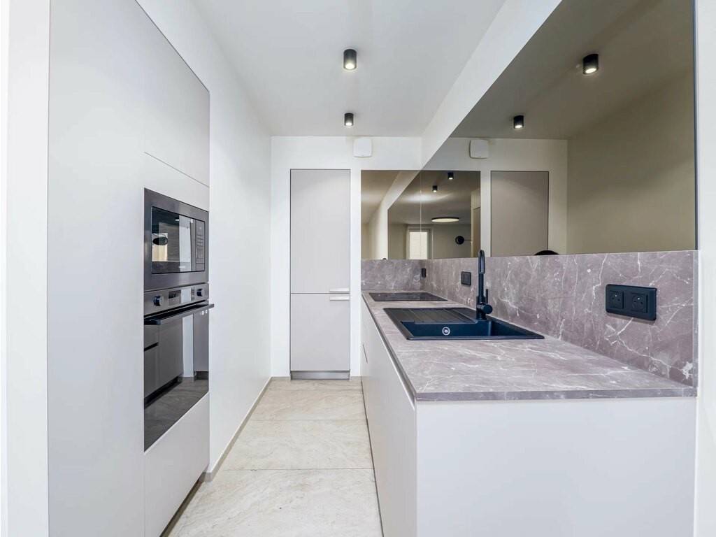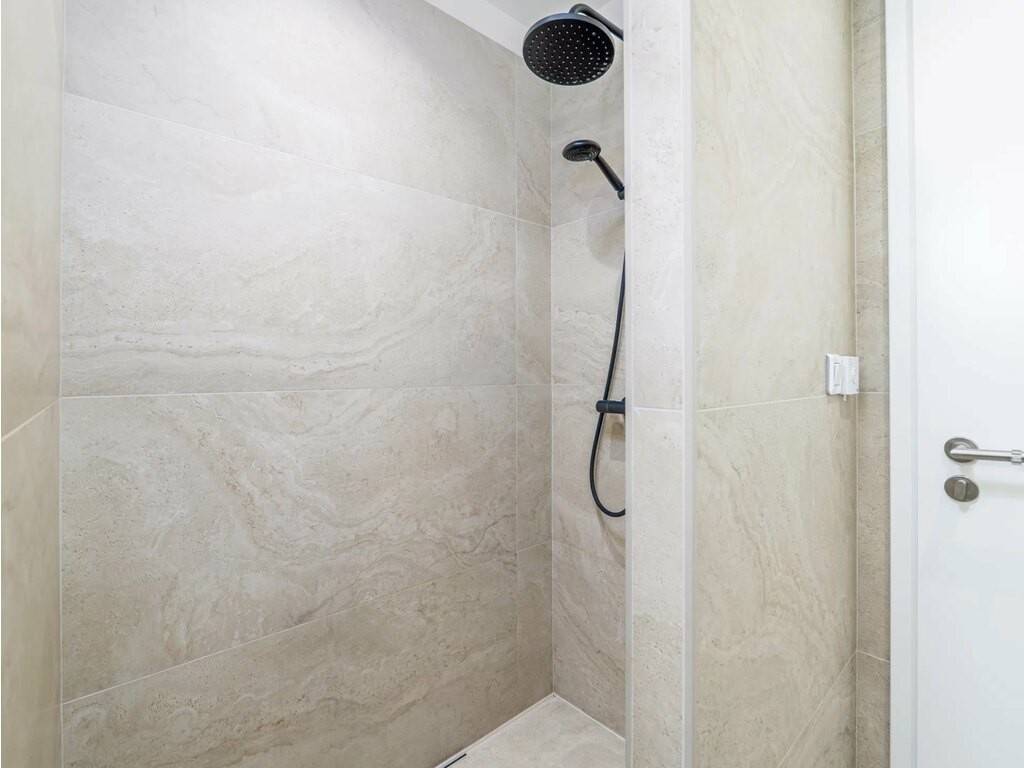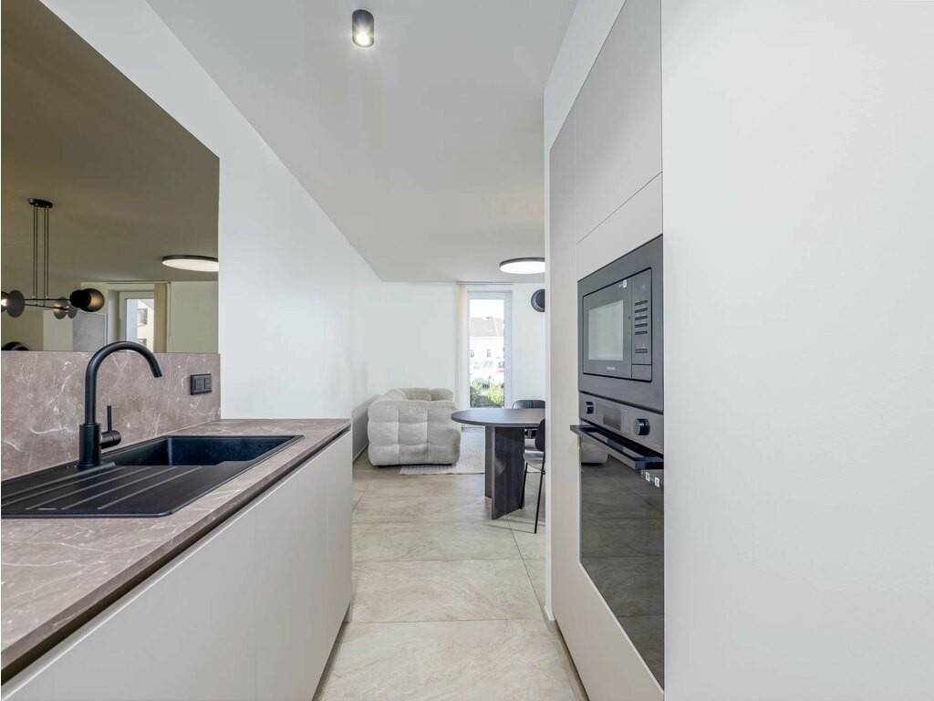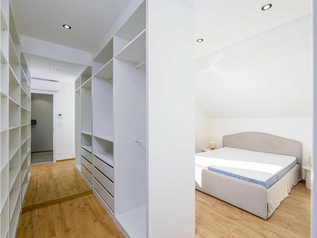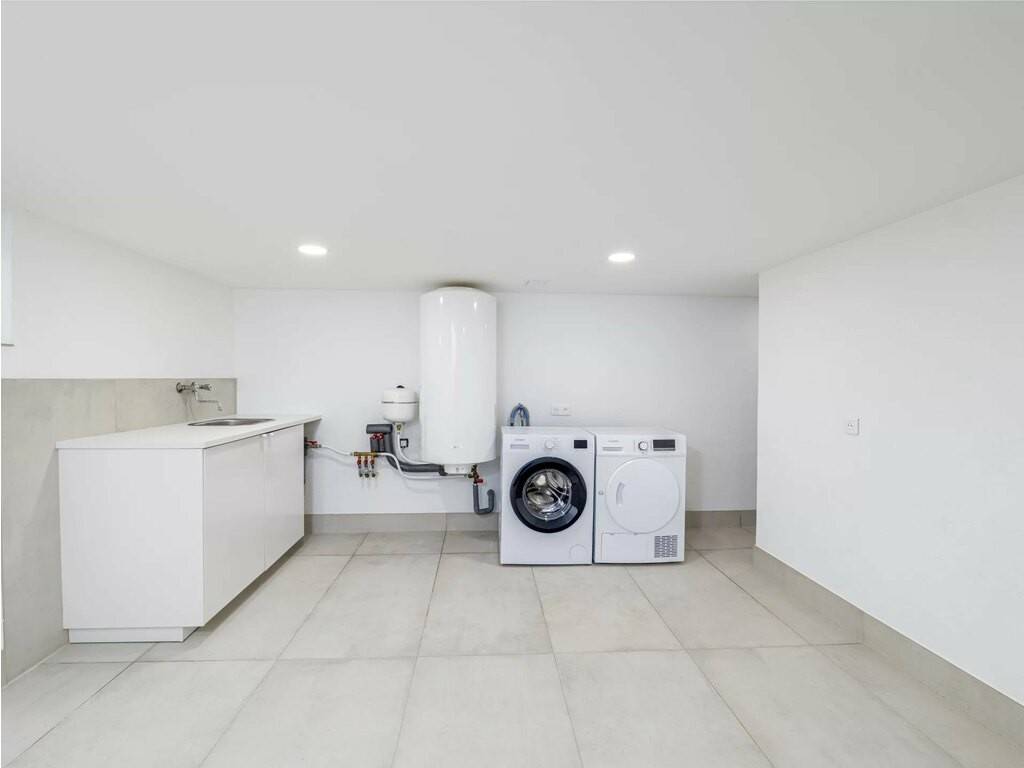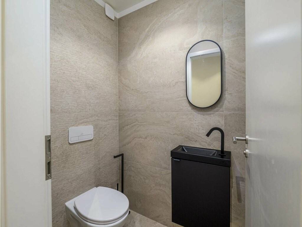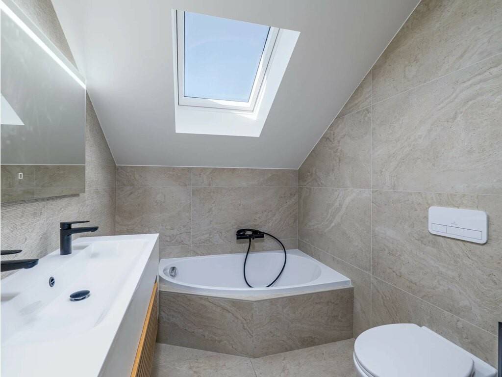 The property features a bathroom with a corner bath under a skylight and a walk-in shower, as well as a separate designer WC on the ground floor. A cellar with laundry room completes the package. Quality finishes throughout: marble-effect tiling, black fixtures, built-in appliances. Public parking available nearby.