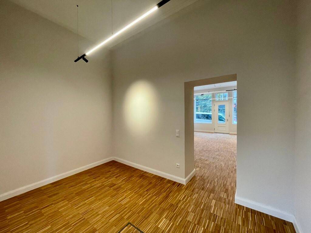 Rez-de-chaussée lumineux : une spacieuse pièce principale avec armoire intégrée, ainsi qu'une seconde pièce à l'arrière, idéale pour un bureau privé ou un espace de stockage.
