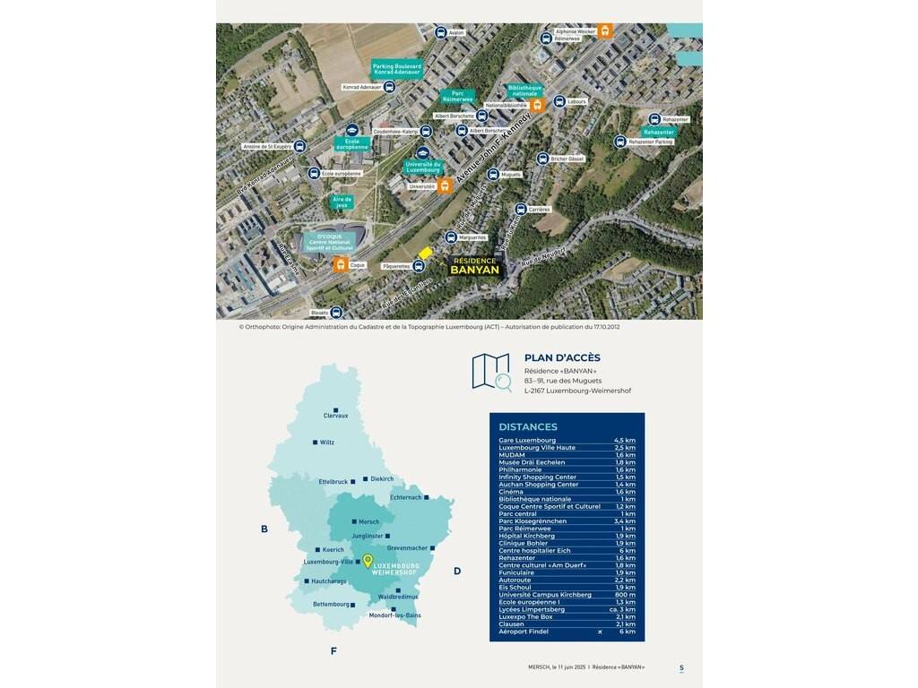 Situé dans un environnement résidentiel paisible et verdoyant, la résidence «Banyan» à 83–91, rue des Muguets bénéficie d’un emplacement stratégique à Luxembourg-Weimershof, à la frontière immédiate du Kirchberg. Ce quartier calme et recherché séduit par sa qualité de vie, tout en offrant un accès immédiat aux infrastructures les plus modernes de la capitale. La résidence sera implantée sur un terrain de ca. 19,60 ares.
