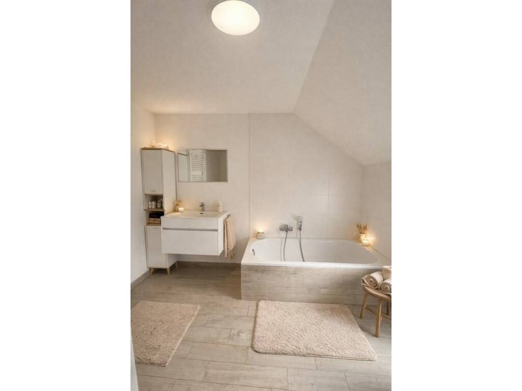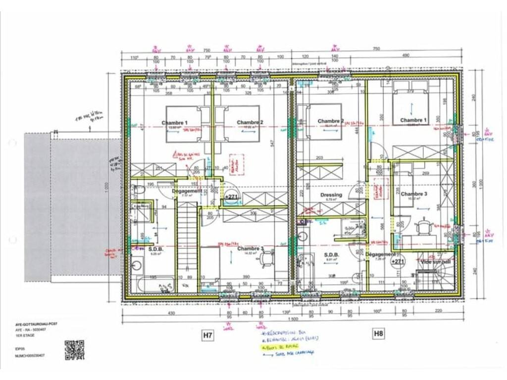 Un hall de nuit 2 chambres 1 chambre parentale avec un coin dressing Une salle de bain avec baignoire, douche, meuble lavabo et un WC Un grenier