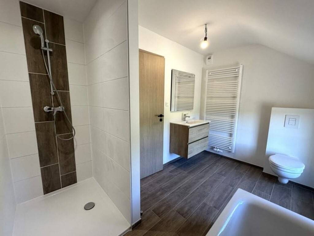 • Salle de bains complète avec douche, baignoire, meuble lavabo et WC