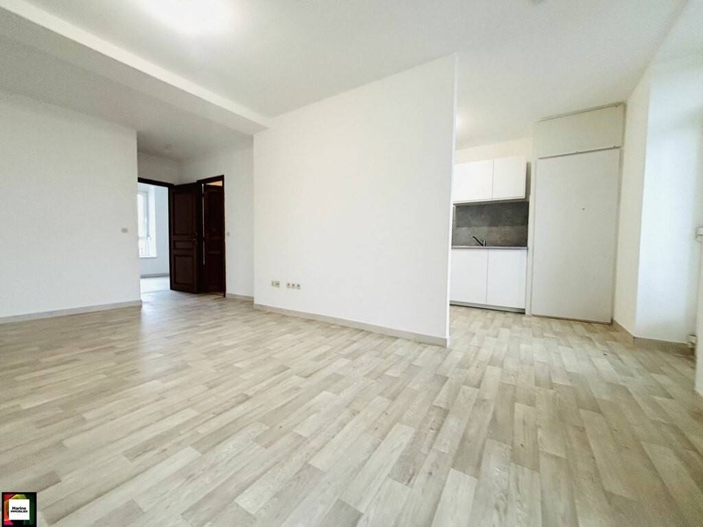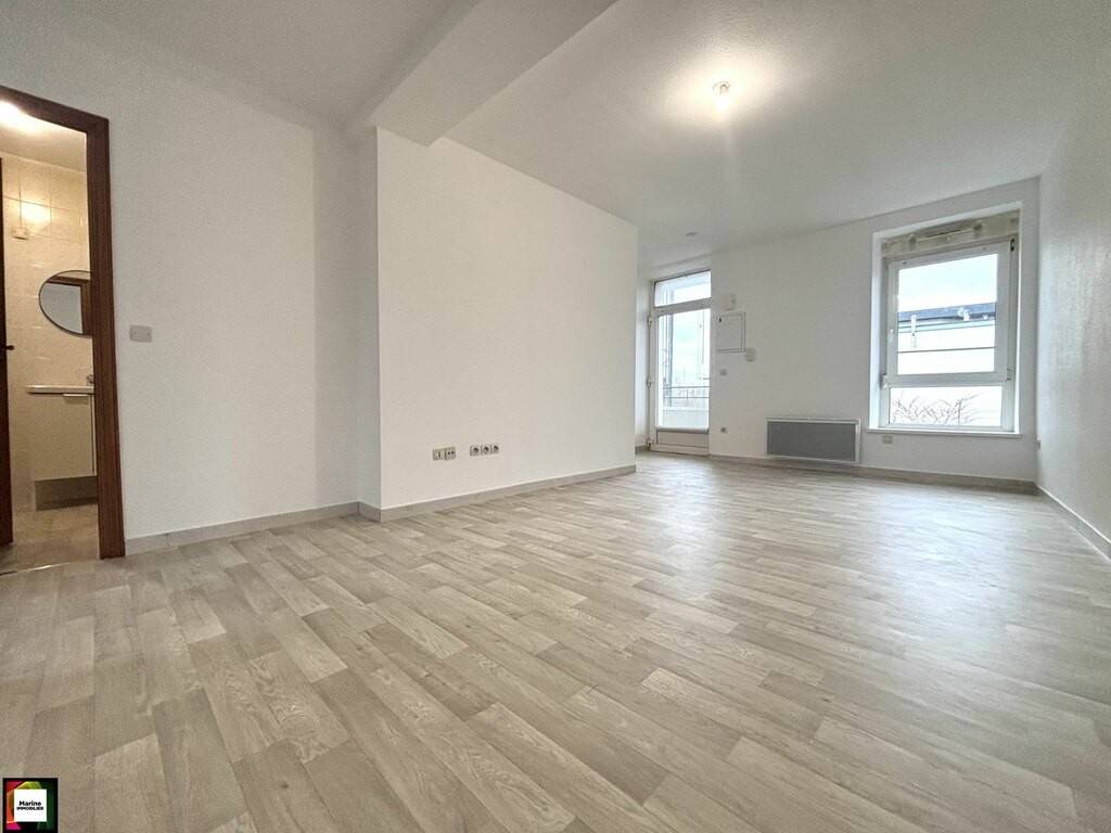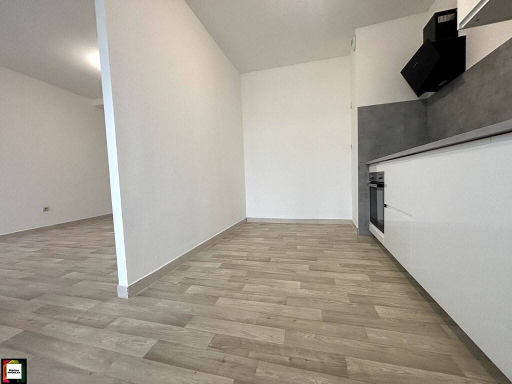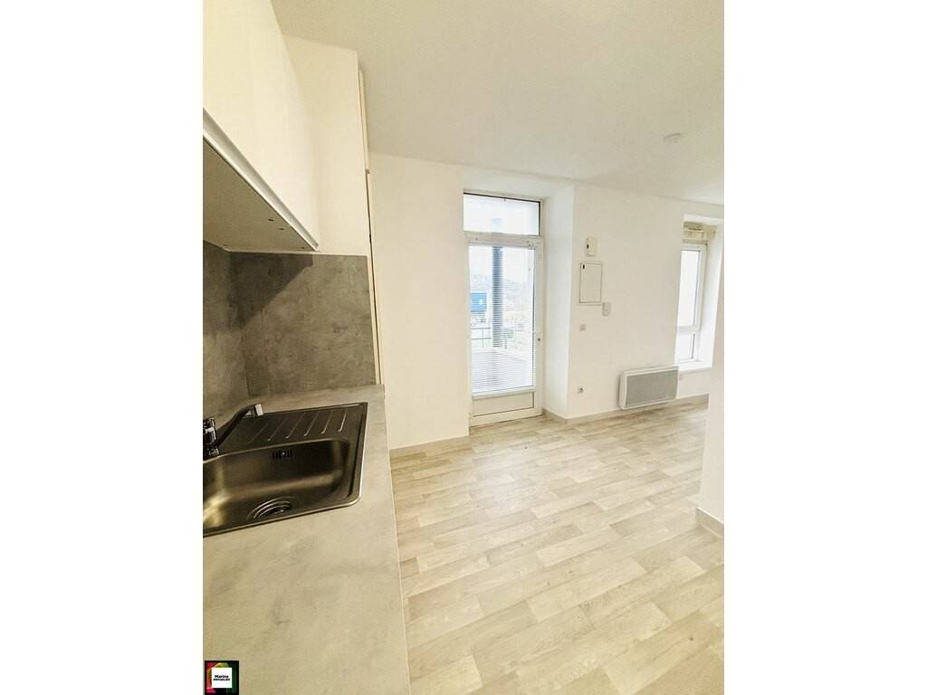 L'appartement se compose d'une entrée donnant sur une cuisine neuve intégrée et équipée d'un four, d'une plaque de cuisson et d'une hotte, ouverte sur un séjour lumineux, une salle de bains équipée d'une baignoire, d'une vasque avec meuble, d'un WC et d'un emplacement pour machine à laver.