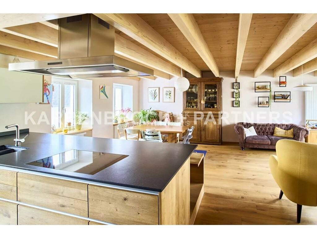 This enchanting property from 1850, which was carefully renovated in 2018, combines the charm of the past with modern living comfort. With a generous living area of 175 m², the house offers plenty of space and a bright, inviting atmosphere. The heart of the house is the open-plan living and dining area, which is directly adjacent to the kitchen. Large window fronts provide plenty of daylight and offer a seamless transition to the large terrace and the idyllic garden.