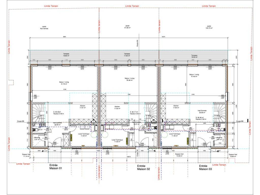 Hall d'entrée, WC séparé, débarras, salon-salle à manger-cuisine ouverte (59m2) avec accès terrasse 19,60m2 et jardin, local technique.