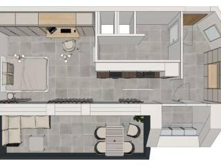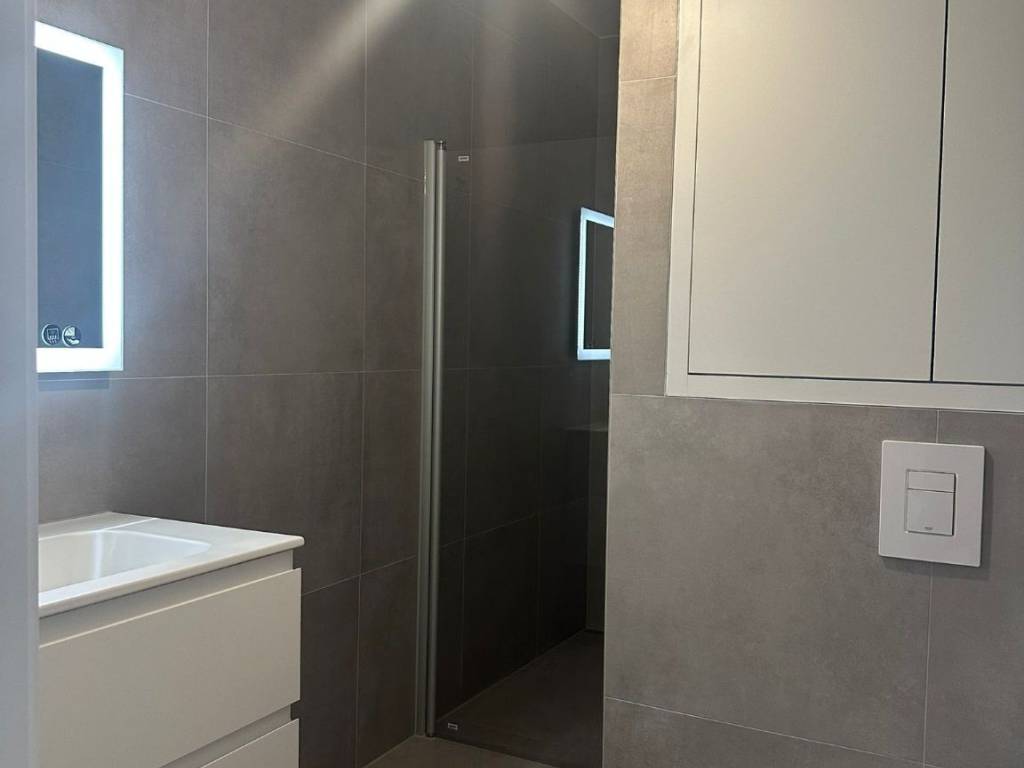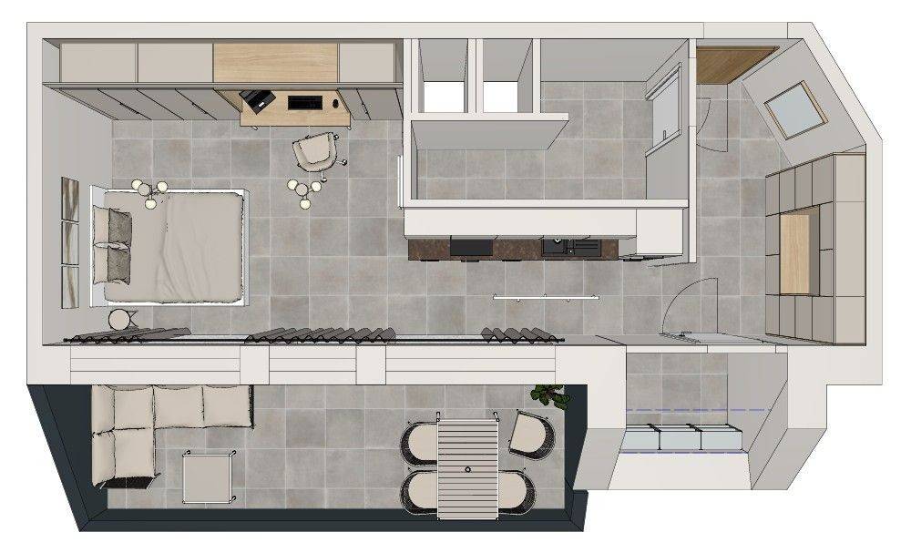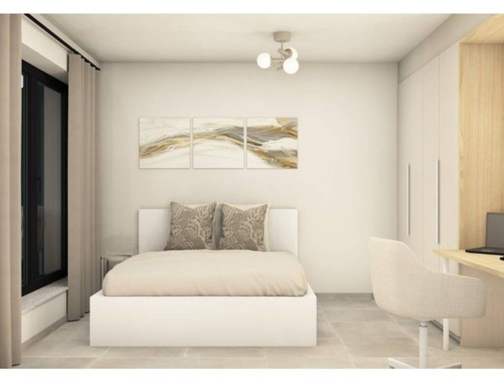 The apartment will be fully furnished as shown in the 3D visuals, including a high-quality fitted kitchen with oven, hob, hood and fridge. Open-plan living/sleeping area with floor-to-ceiling windows, walk-in shower bathroom, and a generous queen-size bed (180 × 200 cm) for maximum comfort.