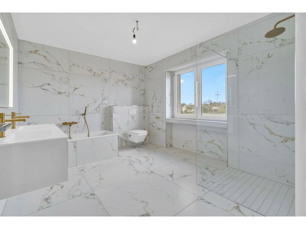 12 m² bathroom with double sinks, shower, bathtub, and toilet