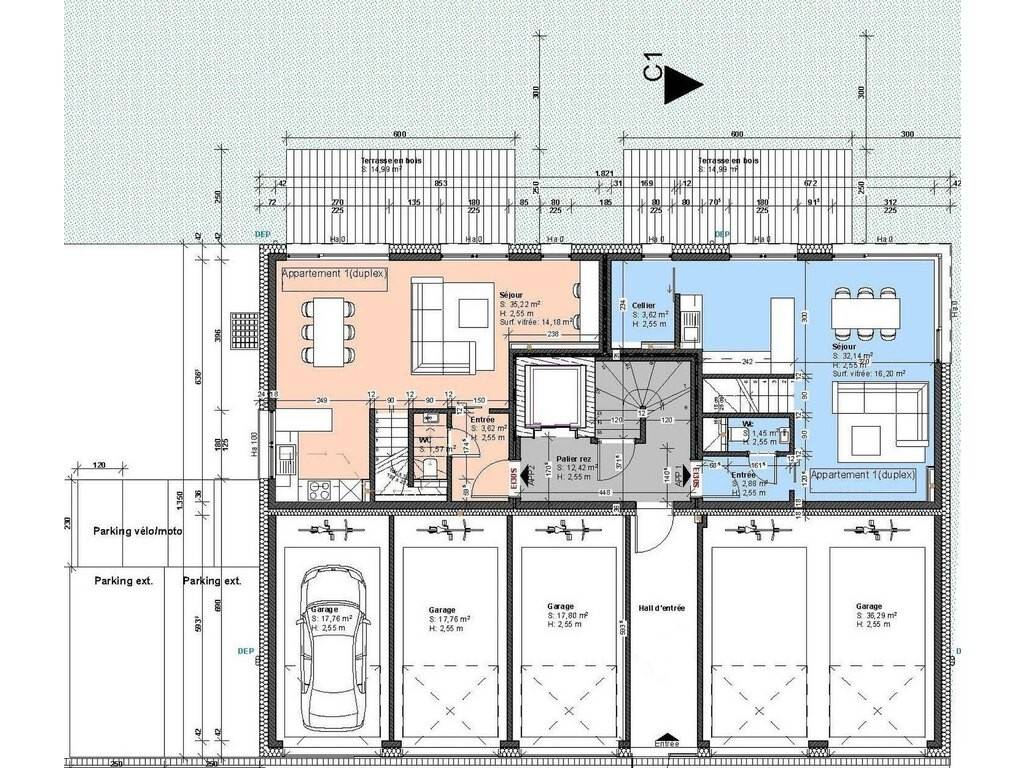 - un jardin privatif d'environ 0.42 ares (044) avec une terasse d'environ 15m², un balcon d'environ 12.9m² - une cave (005) - un grand garage pour DEUX voitures (013)