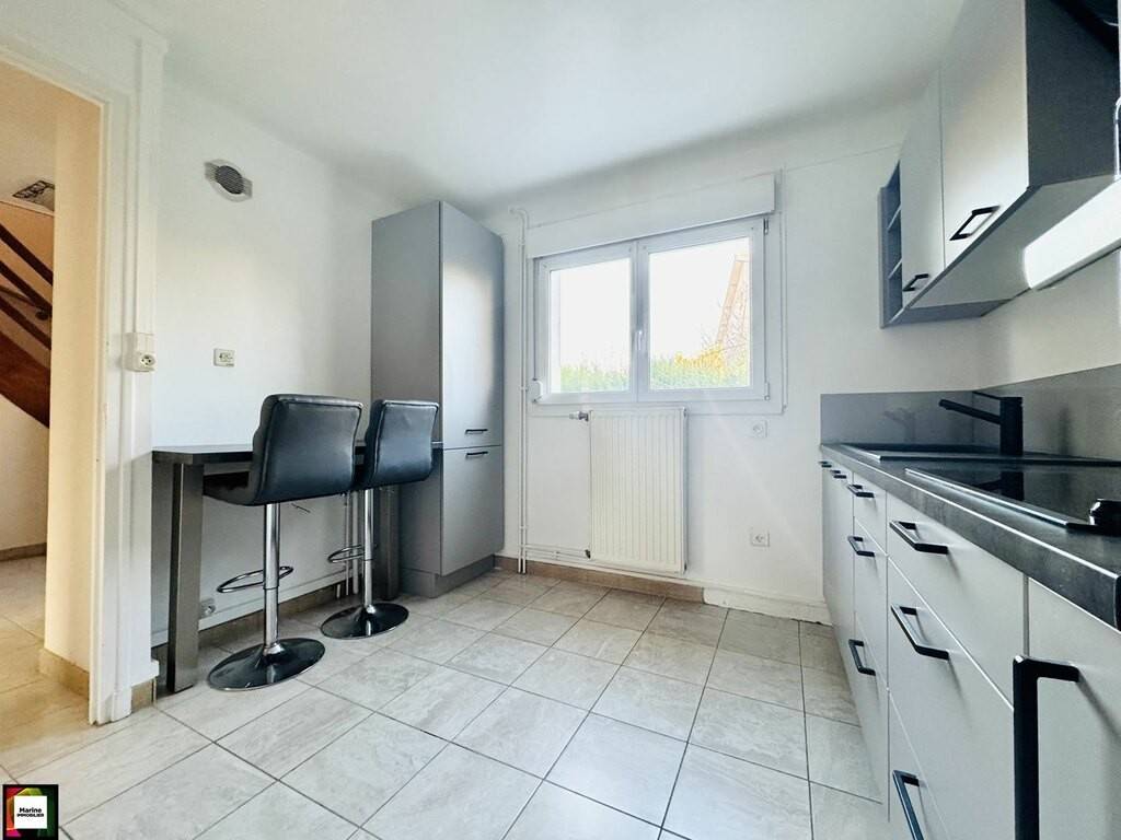 La maison se compose, au rez-de-chaussée, d’une entrée desservant un toilette indépendant, une cuisine intégrée et équipée (four, plaque de cuisson, hotte et micro-ondes), ainsi qu’un espace salle à manger et salon.