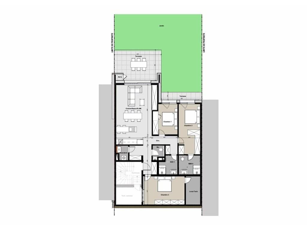 - A distribution hall - A living-dining area with open kitchen with access to the main terrace and garden - 2 bedrooms - A shower room with WC - A 3rd bedroom with private shower room and terrace access - A laundry room - A technical room - A separate WC