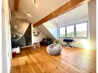 Third floor: A door at the top of the stairs leads to a space occupying the entire floor. This space offers endless possibilities. At 70 m², it could easily serve as a separate apartment. It features a living area with magnificent high ceilings and, above all, an unobstructed view, as well as a bedroom, an office, a shower room, and a storage area. Ideal for one or two teenagers.