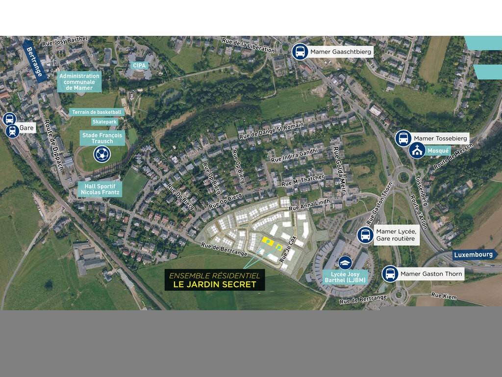 L'ensemble résidentiel « LE JARDIN SECRET » se situe dans le nouveau lotissement « Wëltgebond » à Mamer, 8–12, rue Jo Cox. Elle sera implantée sur un terrain de ca. 20,09 ares.
