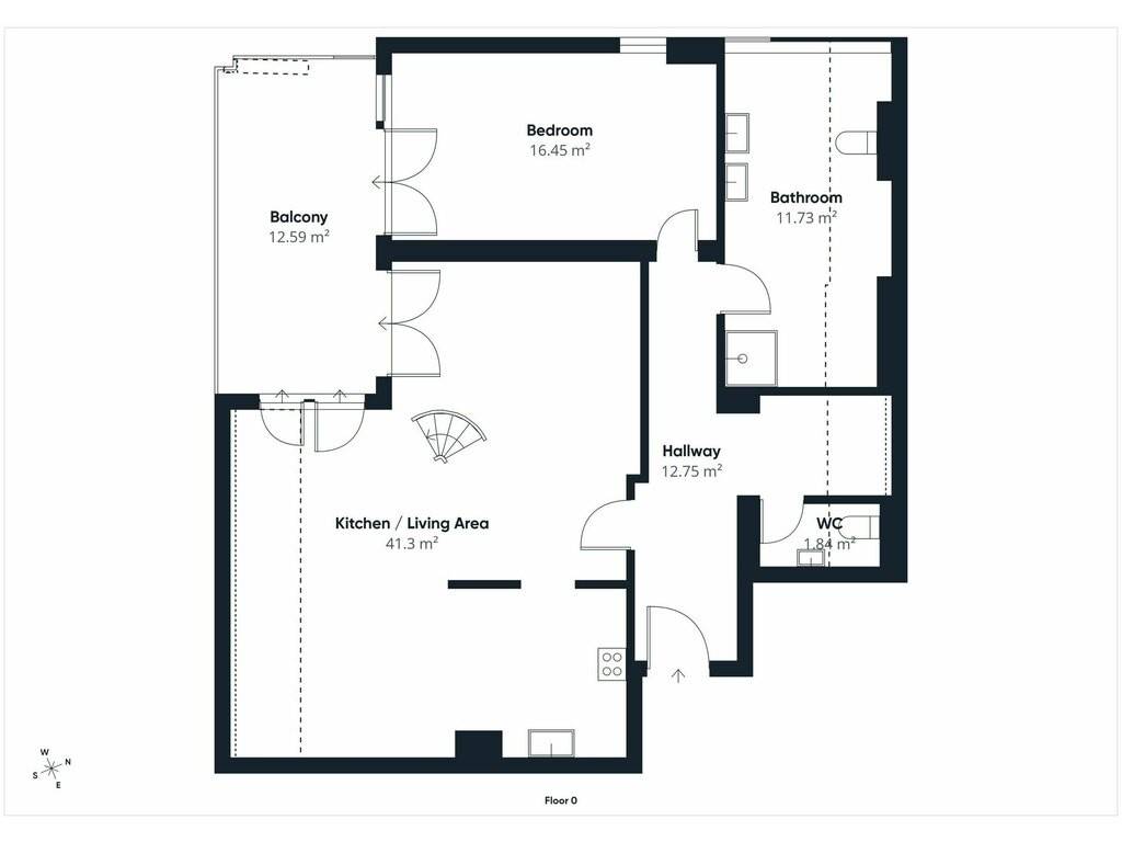 Level 3: Entrance hall (12.75 m²) giving access to all rooms - spacious living area with lounge/dining space and fully equipped integrated kitchen (41.3 m²) with access to the balcony - bedroom (16.45 m²) also with balcony access - shower room with double sink (11.73 m²) - separate WC (1.84 m²)