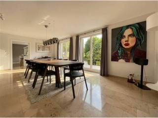 Rénovée en 2014 avec des matériaux haut de gamme, la villa propose de beaux espaces lumineux : vaste hall d’entrée, séjour en L avec feu ouvert et coin bar, cuisine ultra-équipée Bulthaup avec électroménager Gaggenau, arrière-cuisine, garage 2 voitures et caves avec cave à vin climatisée.
