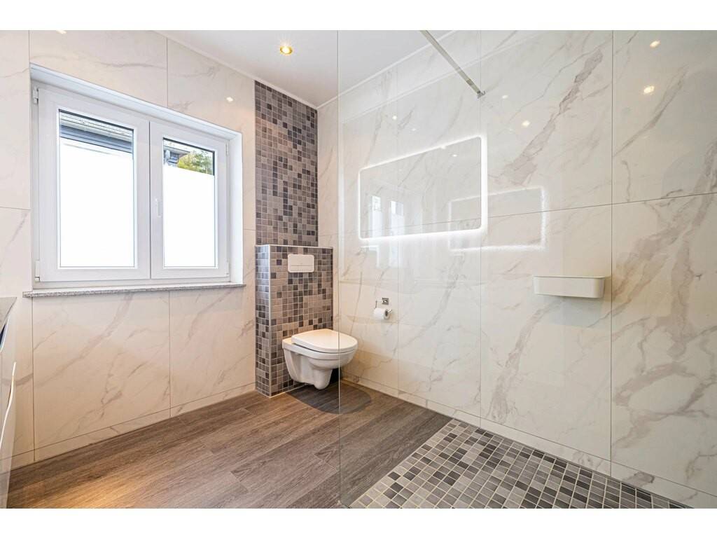 • A shower room with high-quality finishes, a toilet, double sinks, and a window