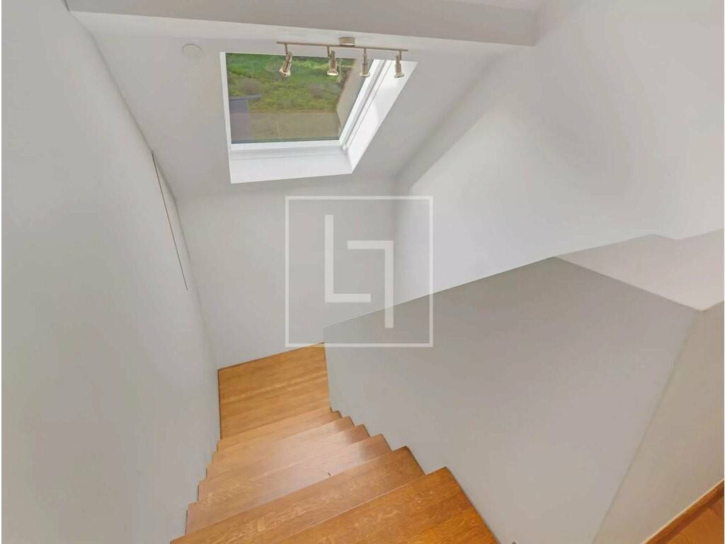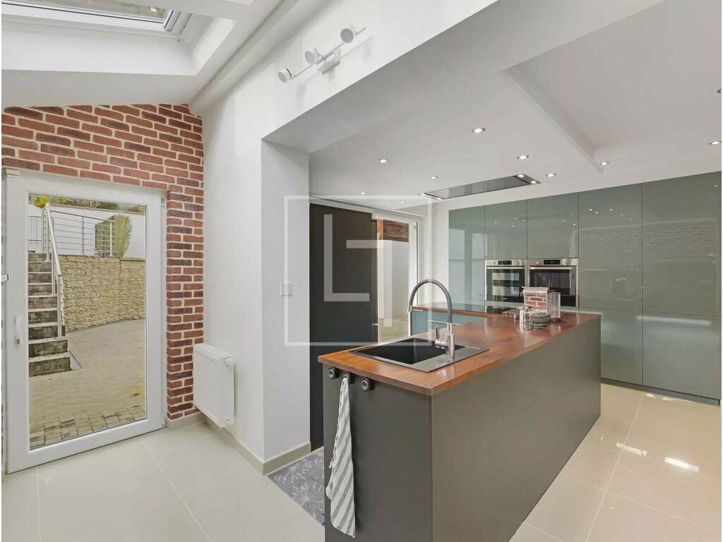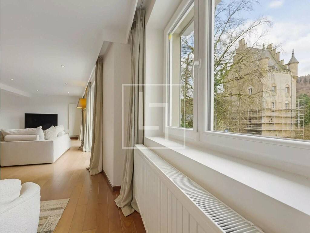 - Entrance hall opening into a superb living room of ± 100 sqm with an open modern kitchen, offering extraordinary volumes and beautiful brightness! - Exceptional view of Schoenfels Castle! - Access to the ± 7 sqm balcony on the street side and at the back, to the spacious ± 71 sqm terrace and terraced garden, wooded, equipped with lighting and watering (garden shed) - First bedroom of ± 15.5 sqm with access to the terrace (possibility of creating a shower room) - Second bedroom of ± 13.2 sqm currently used as an office - Separate WC with hand basin - Cellar/storage near the kitchen