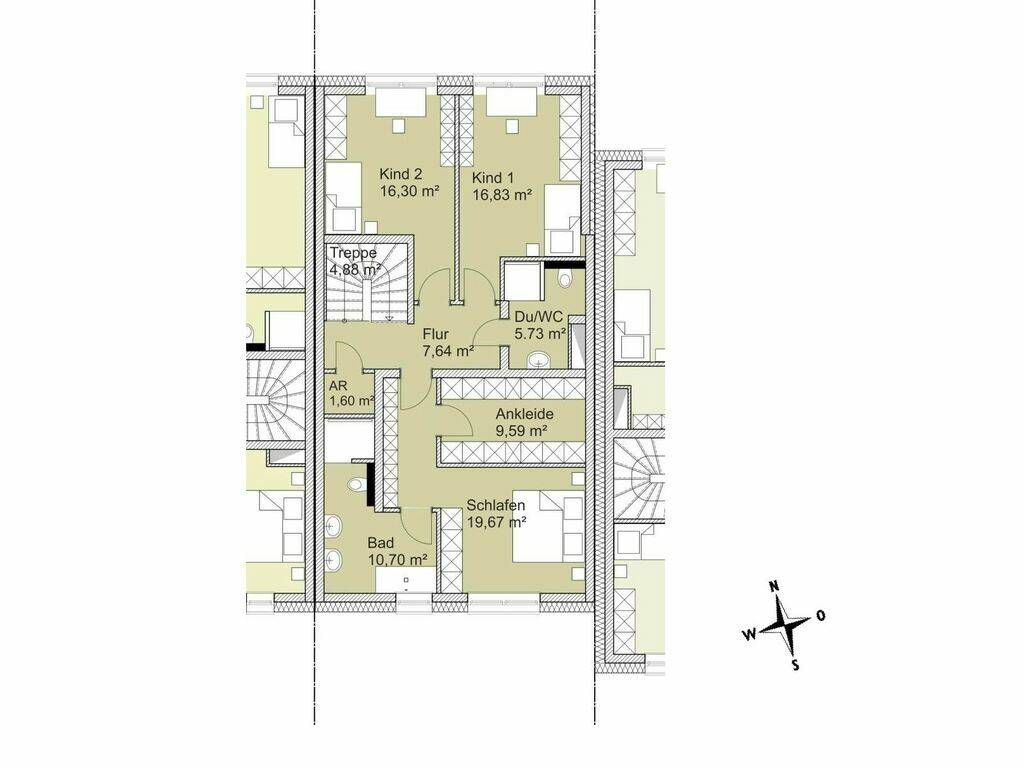 1er étage : trois chambres confortables offrent un refuge idéal. À cela s'ajoute une salle de bains confortable avec baignoire et douche, ainsi que des toilettes séparées. La chambre des parents dispose d'un dressing et d'un accès direct à la salle de bains.