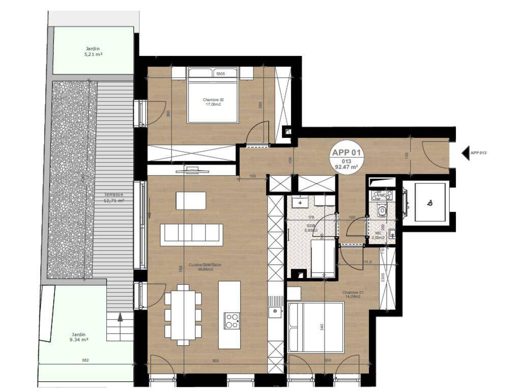 L’appartement 01, situé au rez-de-chaussée, d’une surface pondérée de 98,83 m², dispose d’une surface habitable nette de 92,47 m² auxquels d’ajoutent une terrasse de 12,71 m² et 2jardins pour une surface cumulée de 14,55 m².