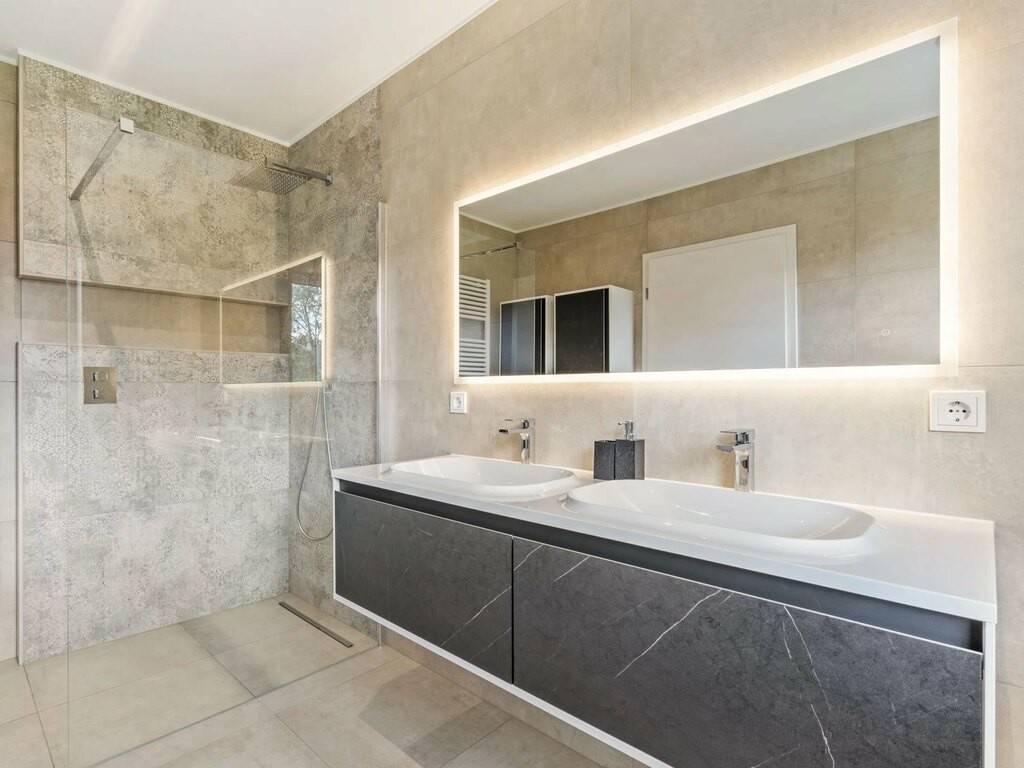 Das erste Obergeschoss bietet drei Schlafzimmer (±17m², ±17.5m², ±27m²), darunter ein Hauptschlafzimmer mit Ankleide und Duschbad, sowie ein Badezimmer.