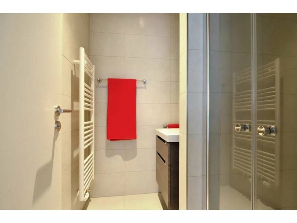 Parquet au sol dans le hall d'entrée, le living et la chambre. Carrelage grés-cérame dans le coin cuisine et les sanitaires ; luminaires ; porte de sécurité ; interphone ; châssis en aluminium triple vitrage; volets extérieurs électriques en aluminium ; système de ventilation double-flux; radiateurs ; chauffage au gaz de ville ; thermostat.