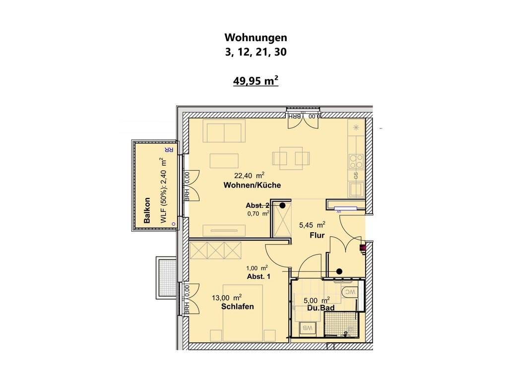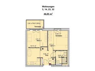 Das Angebot bezieht sich auf die Wohnung 14 im 1. Obergeschoß. Von der zentralen Diele mit Garderobe/Abstellraum gelangen Sie in den hellen Wohn/Eßbereich mit offener Küche von ca. 20 m² mit Ausgang auf den schönen sonnigen Balkon. Dem Kochbereich ist ein sinnvoller Abstellraum zugeordnet Gleichermaßen sind das geräumige Schlafzimmer von ca. 13 m² sowie das Duschbad von ca. 5 m² von der Diele erreichbar. Die Wohnung hat eine Wohnfläche von ca. 46 m². Die Wohnung ist barrierefrei