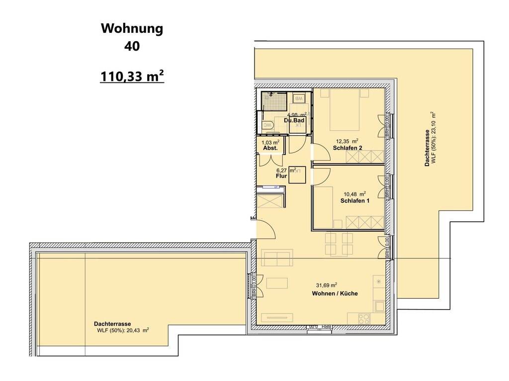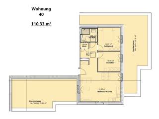 Das Angebot bezieht sich auf die Penthousewohnung 40 im 4. Obergeschoß= Staffelgeschoß. Von der zentralen Diele mit Garderobe gelangen Sie in den hellen Wohn/Eßbereich mit offener Küche von ca. 32 m² mit Ausgang auf die sonnige Dachterrasse 1 von ca. 41 m². Gleichermaßen sind das geräumige Schlafzimmer von ca. 13 m² mit Ausgang auf die Dachterrasse 2 von ca. 46 m², das Kinderzimmer/Büro von ca. 11 m² (ebenfalls mit Ausgang auf die Dachterrasse 2) der Abstellraum sowie das Duschbad von ca. 5 m² mit Dachbelichtung von der Diele erreichbar. Die Wohnung hat eine Wohnfläche von ca. 110 m². Die Wohnung ist barrierefrei